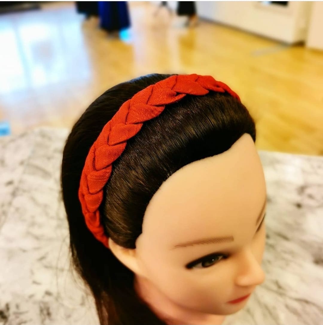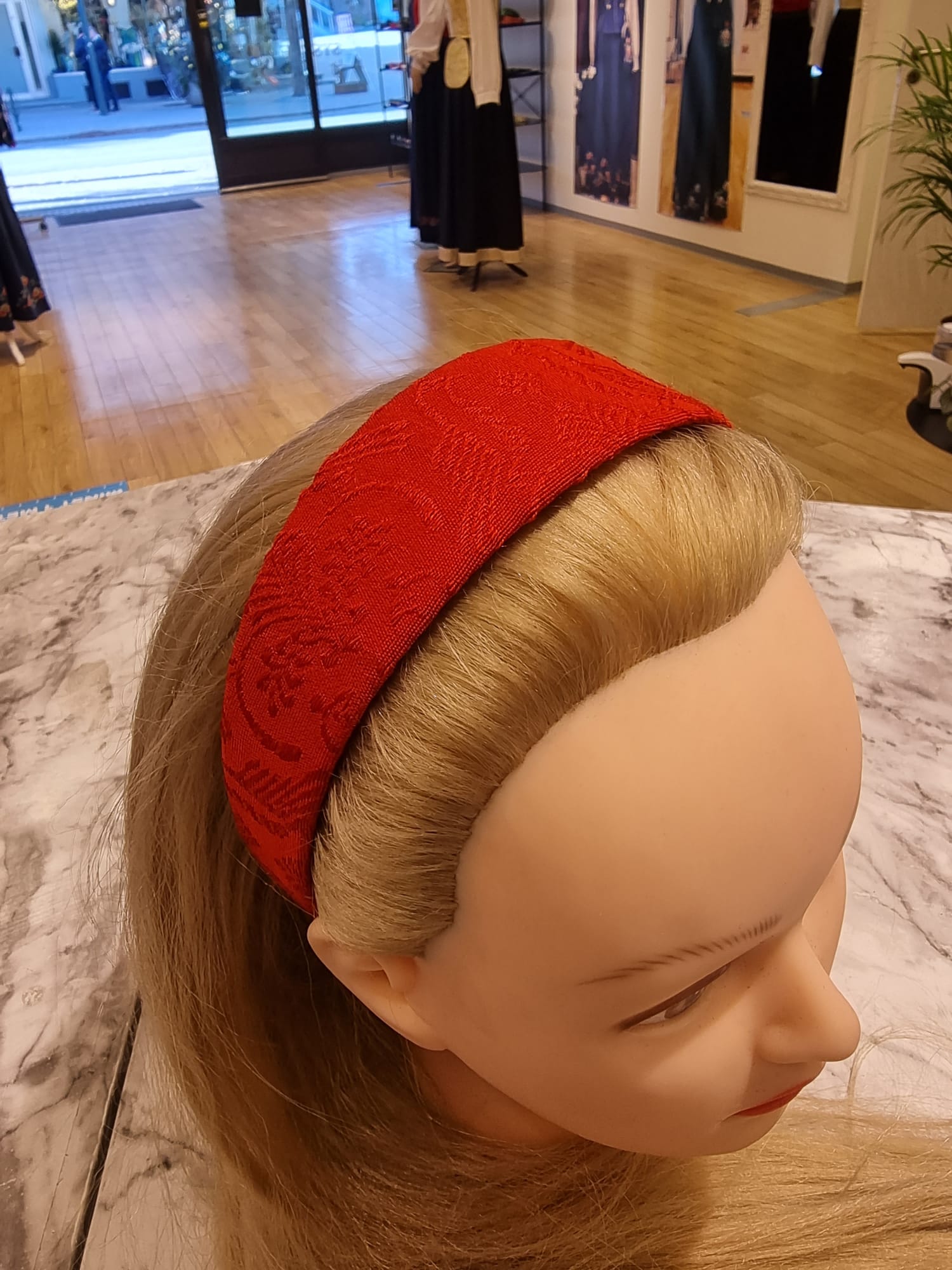 Hårbøyle til Nordmørsbunad laget av samme stoff som rød fuglestoff vest.
